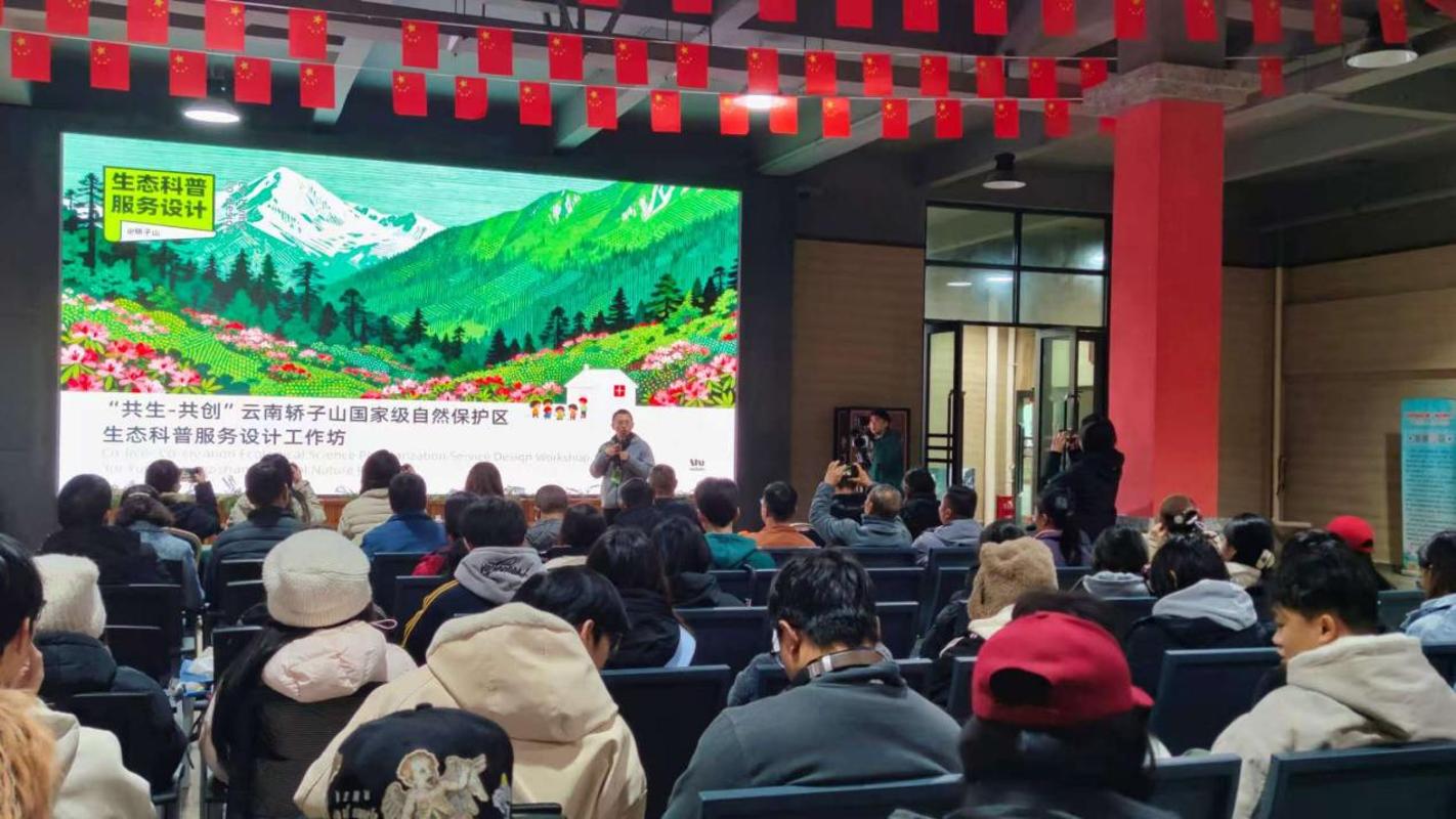工业设计系周祎德老师与环境设计系李想老师、耿莉老师组成的跨学科交叉指导教师团队,带领近60名学生以小组为单位,分别从生态科普、生态文创、生态持续三个维度,与轿子山管护局、旅游公司代表交流本次设计工作坊选题方向及前期构思。现场师生与专家互动频繁,讨论气氛热烈,展现出服务设计为生态保护、科普宣教带来的创新与多元可能。