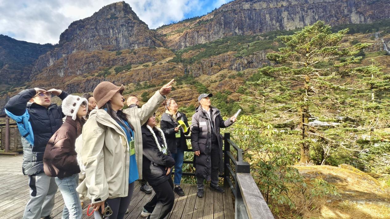 下午的实地调研采风,师生们以轿子山旅游风景区大黑箐为起点,在专业人员带领下,沿预定研学路线逐步深入,系统观察针叶林、高山灌丛等典型植被分布特征,近距离感受高山瀑布、花溪等自然景观。同学们通过摄影、录像、手绘等方式记录素材。“身临其境的感受完全不同,前期通过桌面调研获取的生物多样性数据一下子鲜活起来。”一位参与同学在途中感慨,“这次实地探访让我们对‘生态保护’有了更具体、更深刻的理解,也激发了更多创作灵感。”