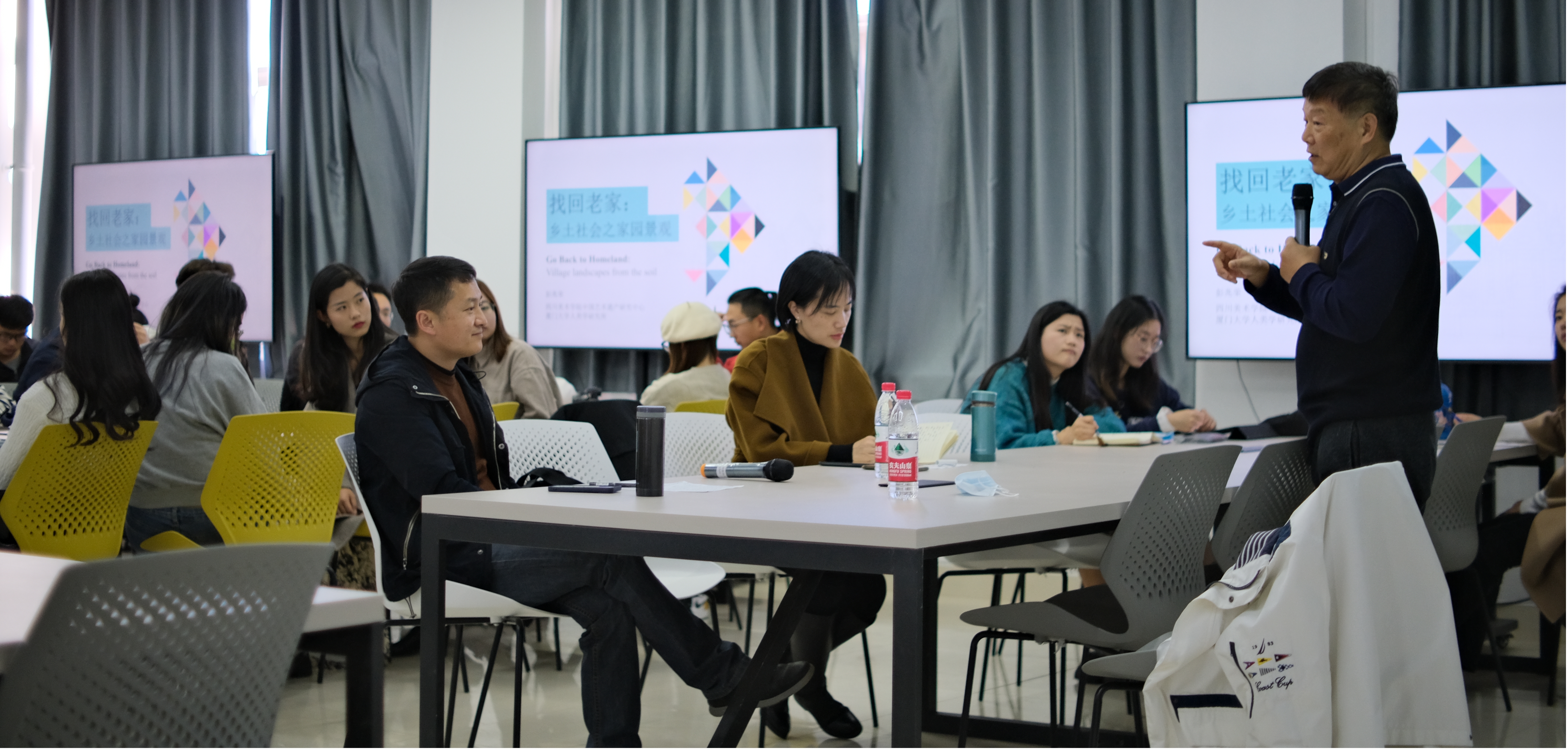 彭老师引用费孝通、梁漱溟关于中国社会乡土性的论述,告诉大家:乡村建设是一个宏伟的时代命题。“乡村兴则国家兴,乡村衰则国家衰。”中国绝大多数人都源于乡村,而我们如今已经逐步丢失了对乡土的根脉认知。接着,彭老师从“家园的表情”“景在五行中”“被加速的乡村旅游景观”“找回老家”等维度,和同学们分享了他关于“重建中国乡土景观”的研究心得。