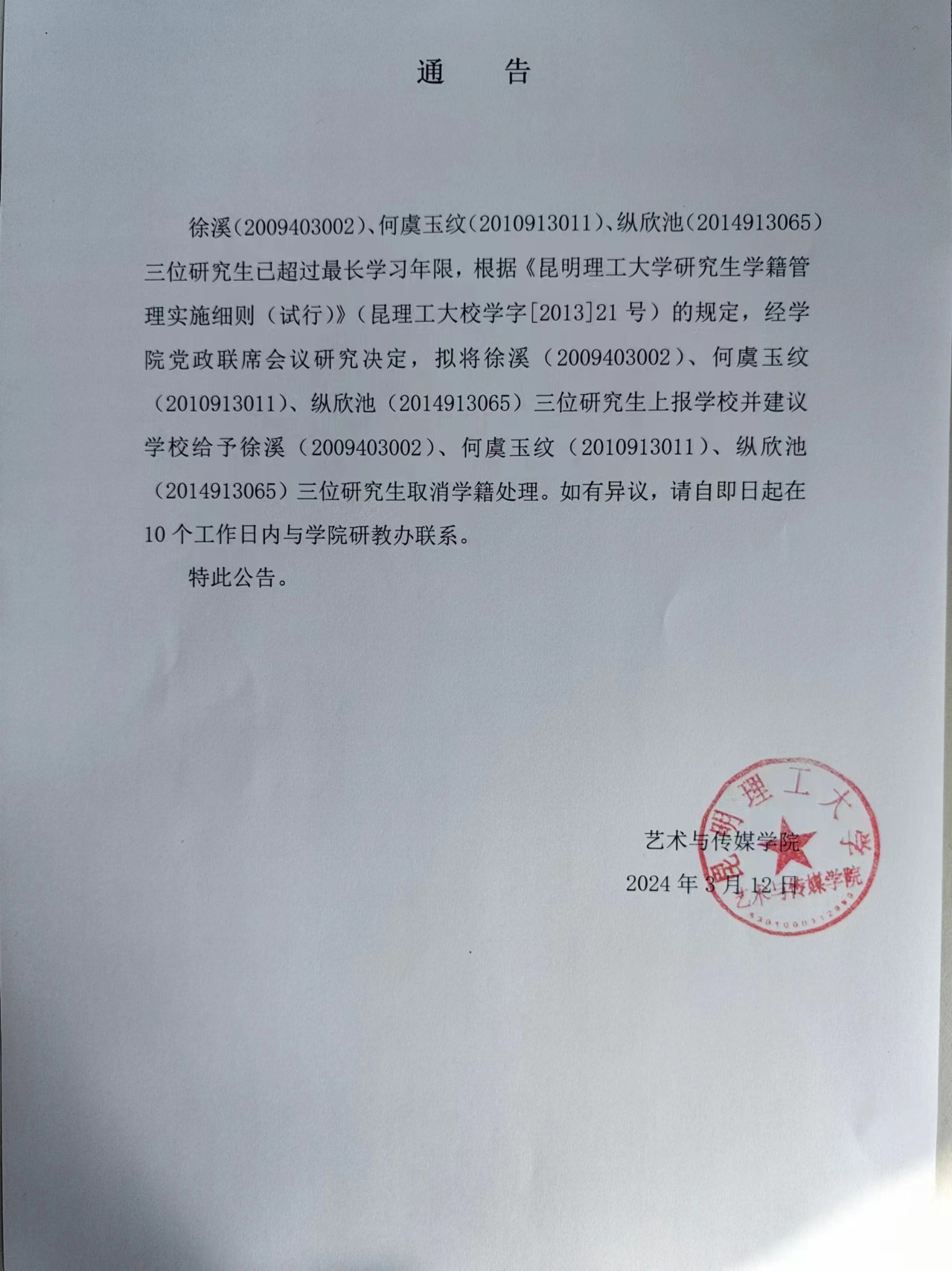 研究生学籍管理实施细则(试行)》(昆理工大校学字[2013]21号)的规定,经学院党政联席会议研究决定,拟将徐溪(2009403002)、何虞玉纹(2010913011)、纵欣池(2014913065)三位研究生上报学校并建议学校给予徐溪(2009403002)、何虞玉纹(2010913011)、纵欣池(2014913065)三位研究生取消学籍处理。如有异议,请自即日起在10个工作日内与学院研教办联系。