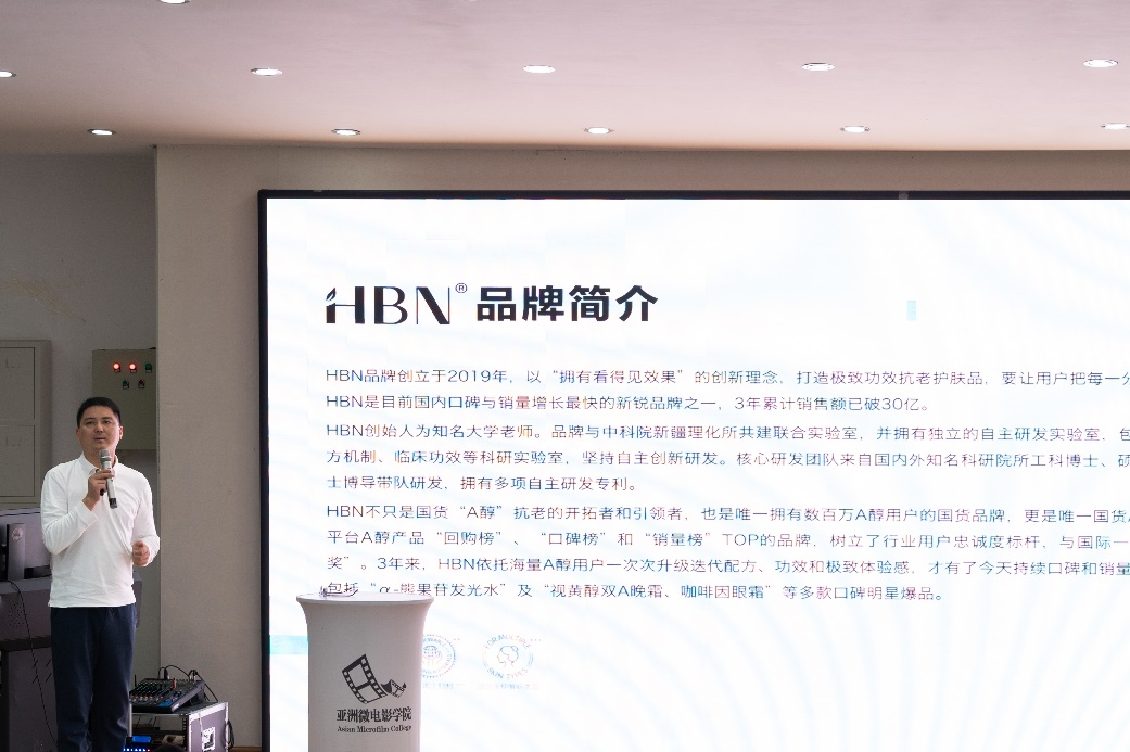 郝儒梁老师进行命题解析。他对HBN的品牌和功能做了详细介绍,分享了HBN产品对老师和同学有帮助的功能,以及对本届HBN大广赛命题做出具体解析。郝儒梁老师介绍到HBN品牌创立于2019年,是一家依托科研创新,以“拥有看得见的效果”为创新理念,力求打造出极致抗老护肤的护肤品牌。同时,郝儒梁老师也鼓励在场同学使用HBN“早C晚A”的理念进行设计,希望大家在作品创作时能够找准核心点。最后,他预祝同学们在今年大广赛中创立精品,取得佳绩。