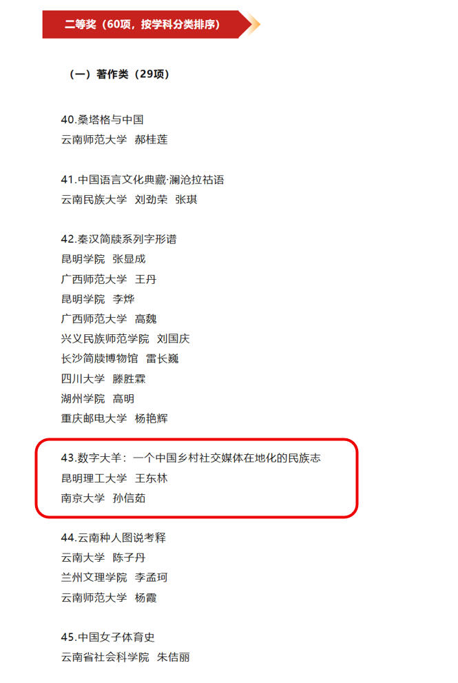王东林副教授凭借学术专著《数字大羊:一个中国乡村社交媒体在地化的民族志》,荣获云南省社会科学奖二等奖,为学院与学校再添殊荣。